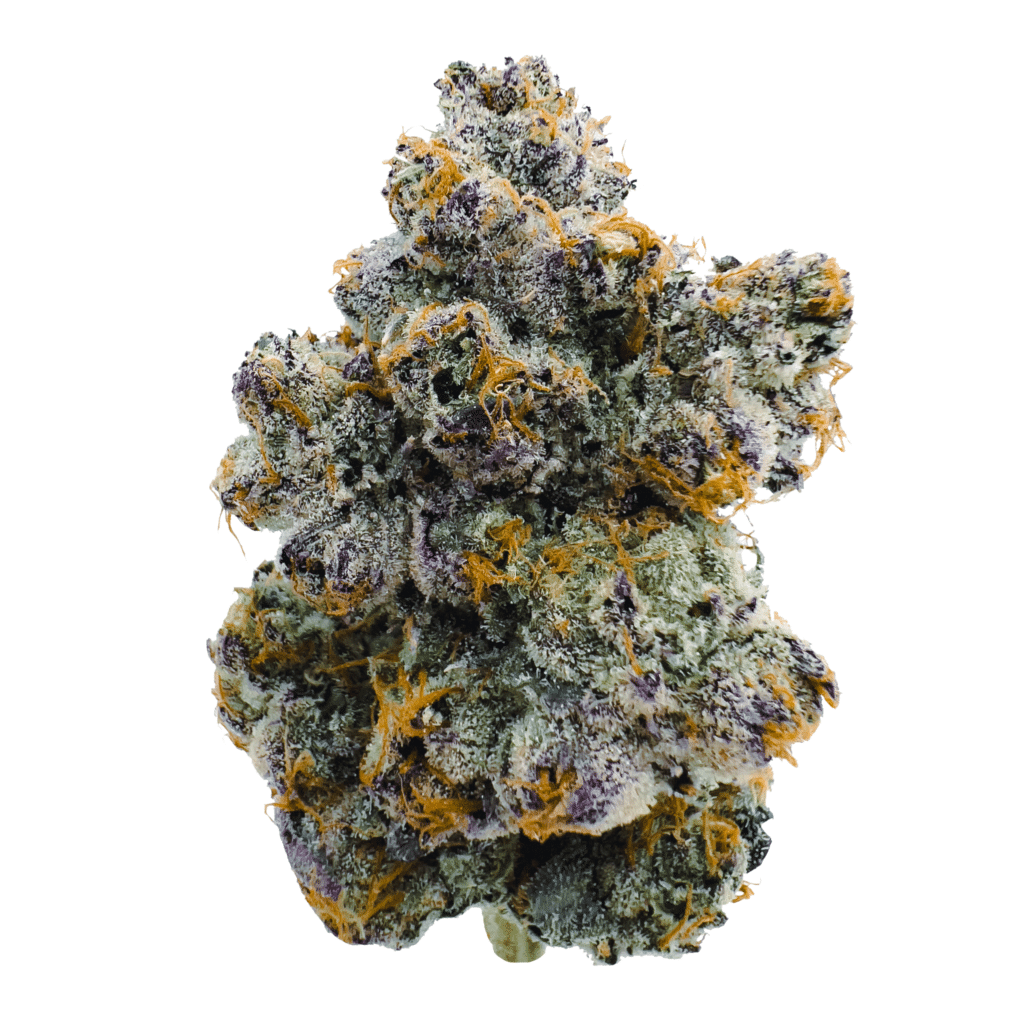 Supreme Runtz is an indica dominant hybrid strain (70% indica/30% sativa) created through crossing the delicious (Gucci X Blue Dream X Gorilla Glue) X Forbidden Runtz strains. Named for its super-powered parentage and delicious flavor, Supreme Runtz is the perfect tasty treat to help you settle in for the night. The taste of Supreme Runtz is the perfect combination of its parent strains, with a sweet and sugary berry candy taste accented by creamy vanilla and a touch of spice. The aroma is just as delicious, with added layers of gassy diesel, too. The Supreme Runtz high will settle in slowly, creeping in and lifting the spirits while simultaneously settling the body. You’ll feel creatively inspired and sociable, ready to get chatting with anyone around you about any topic at all. As your mind lifts, your body will settle down into a place of deep calm that is silent, pleasant and munchie-inducing. Given these effects and its insanely high 20-30% average THC level, Supreme Runtz is often suggested to treat experienced patients with conditions such as appetite loss or nausea, chronic pain, chronic stress or anxiety, depression and PTSD. This bud has oversized and fluffy, dark olive green nugs with vibrant purple undertones, super thin light orange hairs and chunky, purple-tinted white crystal trichomes.